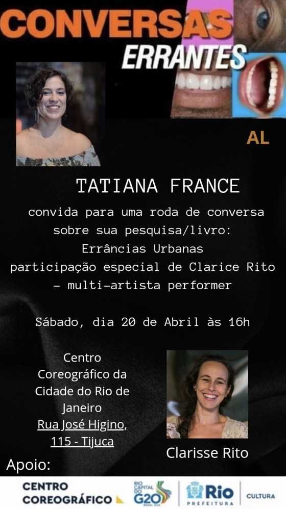 ConversAs eRRANTes Midiateca-CCo A Midiateca do Centro Coreográfico convida: ConversAs eRRANTes TatianA FrancE apresentará sua pesquisa em inteRvenÇÃO UrbanA e … Mais